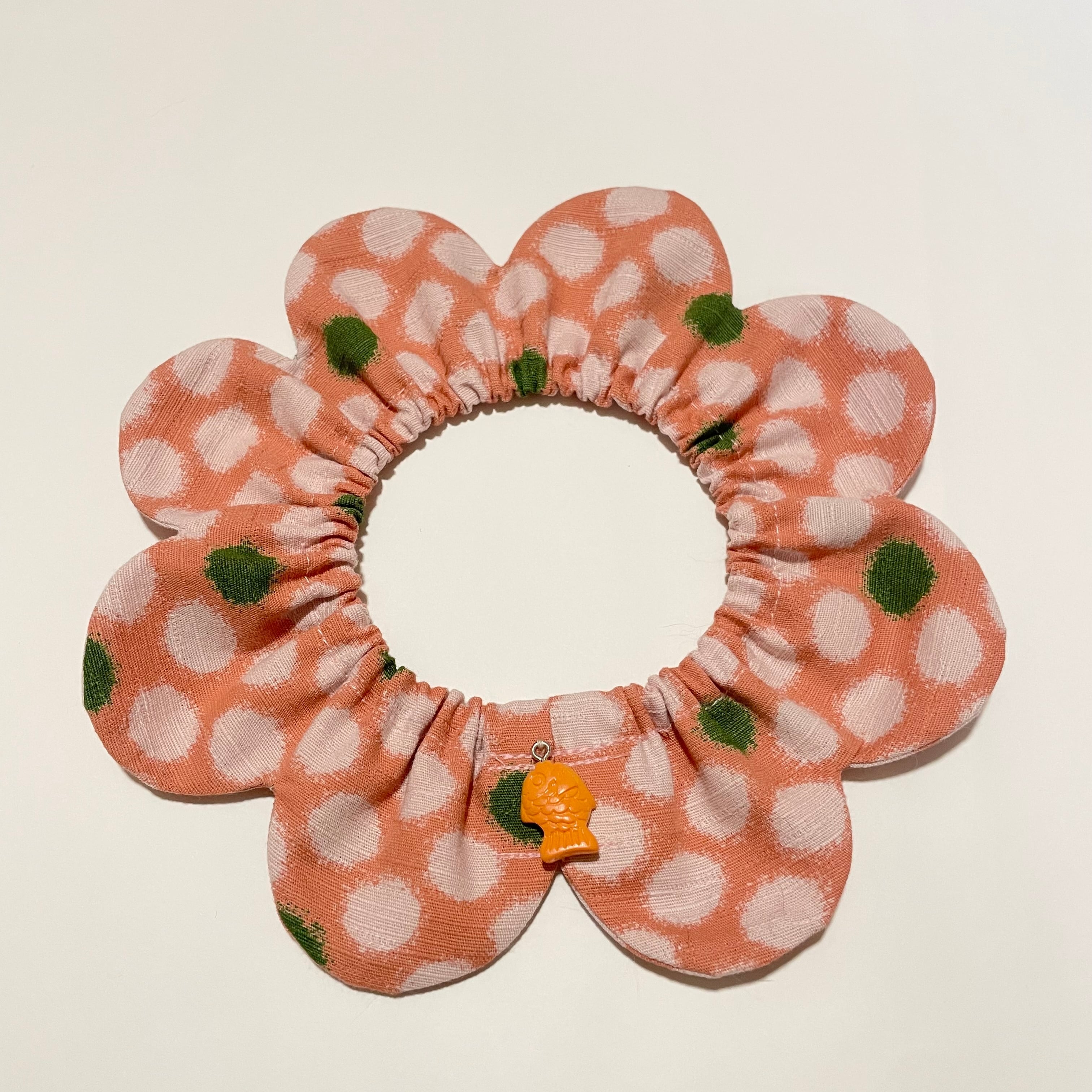 和テイストの水玉柄です。 たい焼きのチャームを付けてみました。